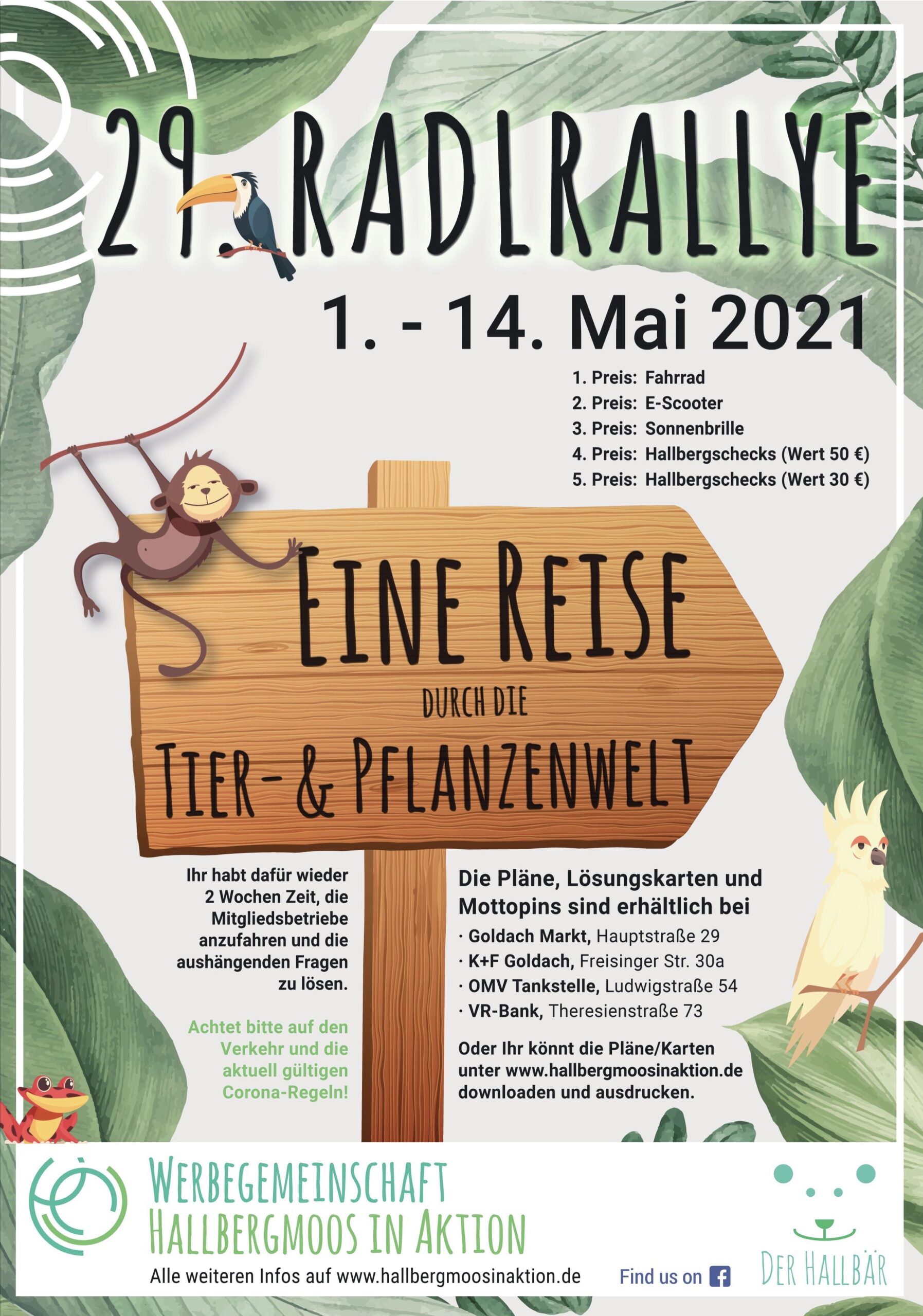 Die Radlrallye 2021 wird tierisch bunt: Auch in diesem Jahr findet die Veranstaltung der Werbegemeinschaft Hallbergmoos in Aktion e. V. Corona-gerecht in einem Zeitraum von 14 Tagen statt. Unter dem Motto „Eine Reise durch die Tier- und Pflanzenwelt“ geht es am 1. Mai los. Dann dürfen Bürgerinnen und Bürger, Familien mit Kindern und alle, die Lust haben sich auf ihr Radl schwingen, Hallbergmooser Betriebe kennen lernen und das diesjährige Rätsel lösen. Zu gewinnen gibt es fünf tolle Preise: ein Fahrrad für den ersten Platz, ein E-Scooter für den Zweiten und eine Sonnenbrille für den Dritten, Hallbergschecks im Wert von 50 Euro für den Vierten sowie 30 Euro für den fünften Platz.